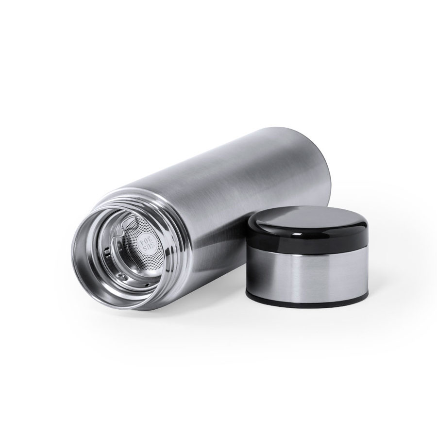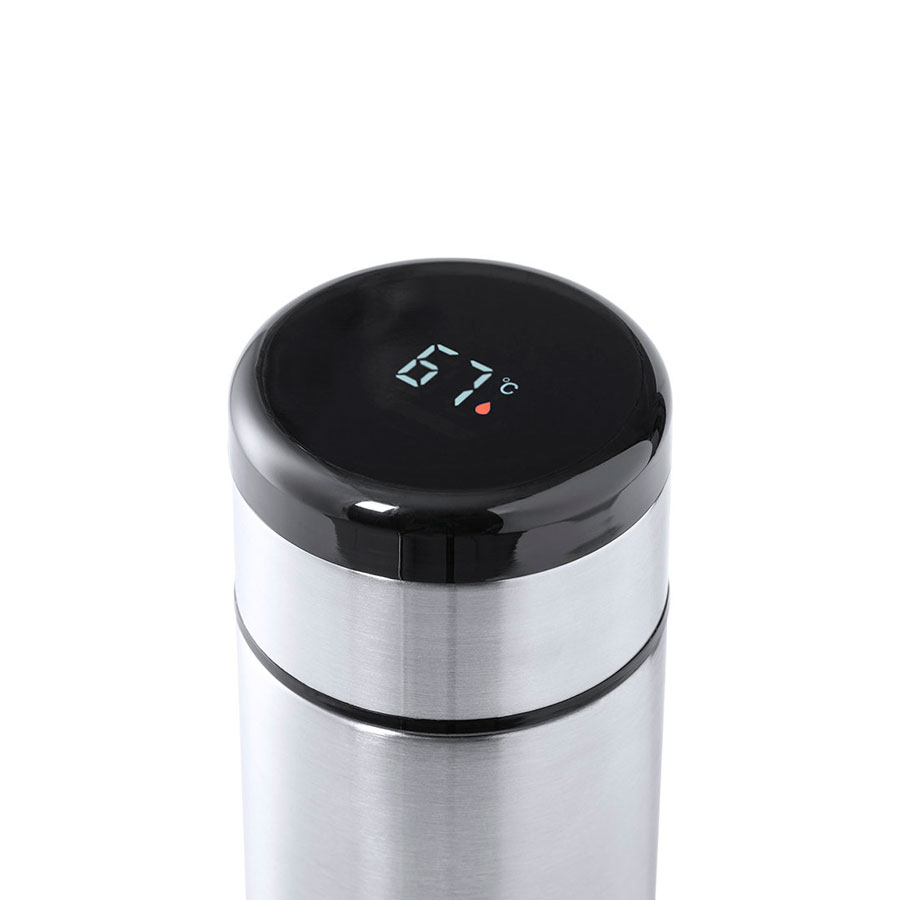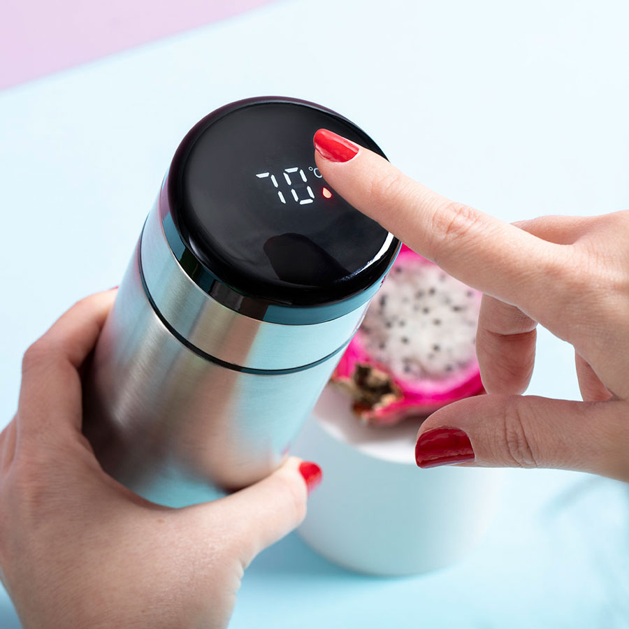 Термос из нержавеющей стали емкостью 420 мл с датчиком температуры и сенсорным экраном, встроенным в крышку. Двойные стенки отлично сохраняют температуру напитка. Термос имеет навинчивающуюся крышку и ситечко. Индивидуальная упаковка - белая картонная коробка с изображением продукта. Батарейка в комплекте.