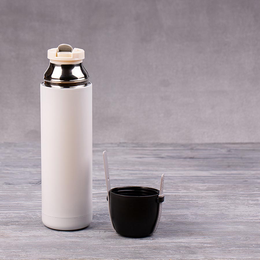 Вакуумный термос Rope с двойными стальными стенками. Важная деталь - ремешок - является не только декором, но и выполняет роль ручки. Для этого нужно застегнуть ее на дальнее отверстие. Сохраняет тепло до 12 часов в зависимости от температуры окружающей среды.
