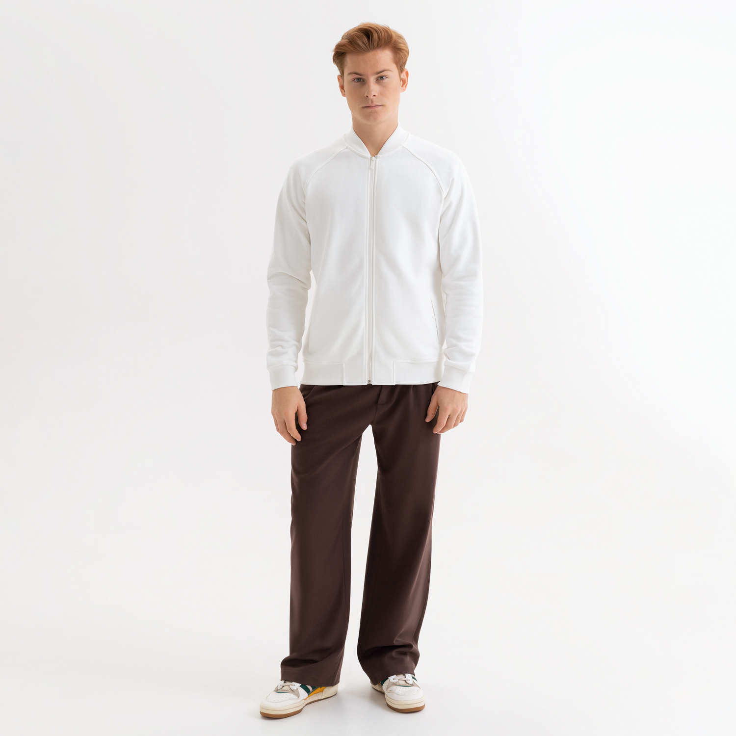 Стильная толстовка бомбер унисекс на реверсной молнии свободного силуэта с прорезными карманами в рамку.