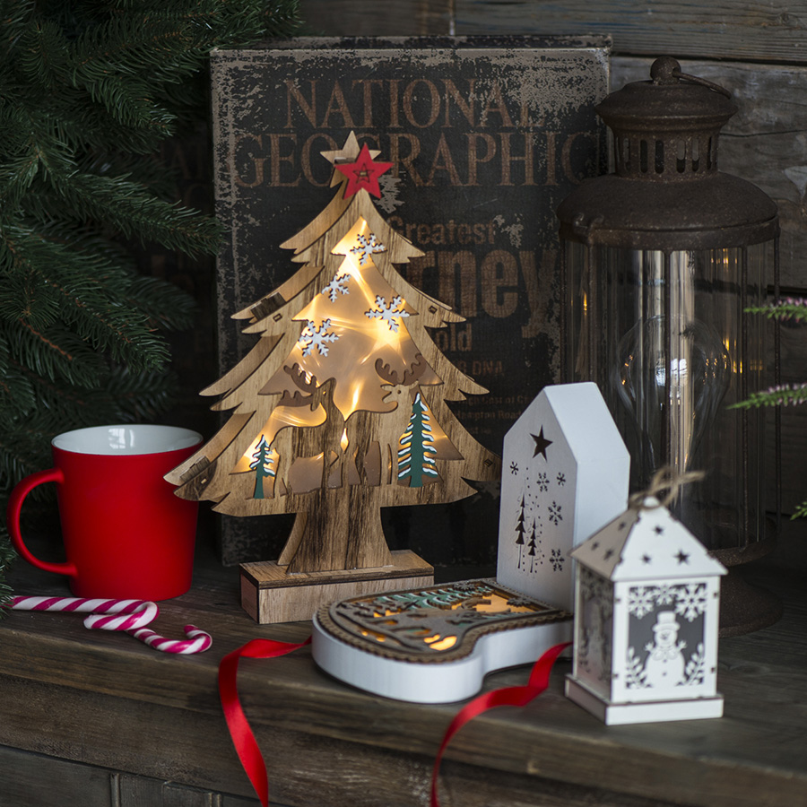 Украшения из дерева - актуальный тренд. Деревянные элементы декора создадут уютную и теплую атмосферу в доме или офисе. Подсветка привлечет дополнительное внимание к предмету и логотипу на нем. Дерево отлично гравируется. Элементы питания в комплекте - батарейки LR 44 (2шт) * Артикул может иметь дефект - следы клея на обратной стороне домика, см. фото. Цена снижена.
