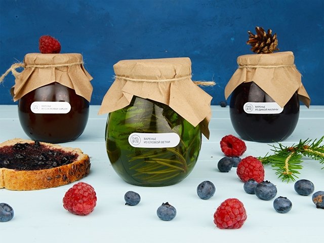 Банка варенья обернута крафт-бумагой, на которую возможно сделать нанесение корпоративного логотипа. Тампопечать (1 цвет (цветные изделия)) на данный товар осуществляется бесплатно. Оплачивается только настройка оборудования в размере 4500 рублей на весь тираж.