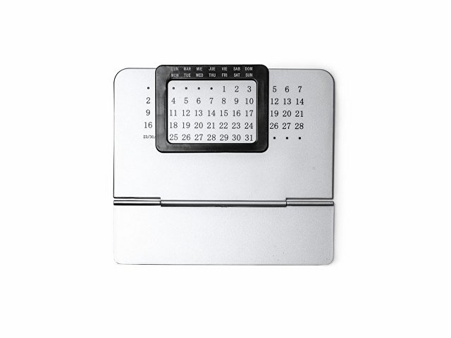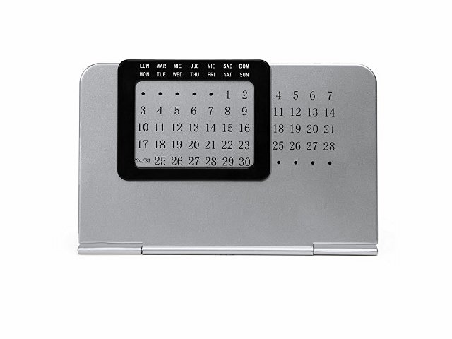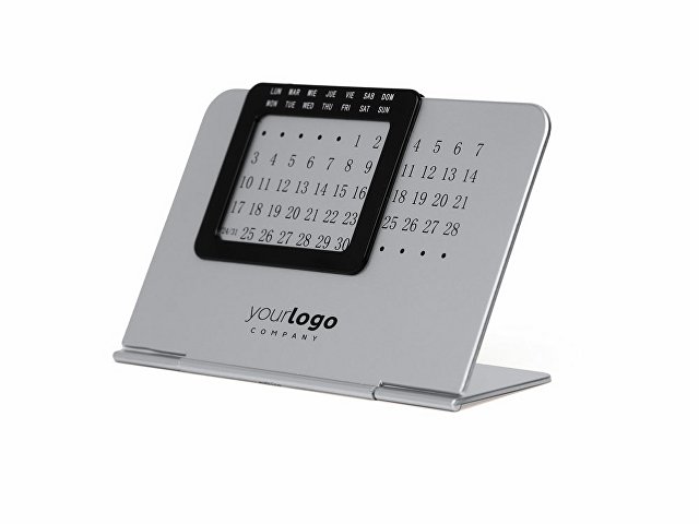 Вечный настольный календарь, состоящий из двух частей: одной серебряной подставки с числовой панелью и черной выдвижной рамки с днями недели на испанском и английском языках. Тампопечать (1 цвет (цветные изделия)) на данный товар осуществляется бесплатно. Оплачивается только настройка оборудования в размере 4500 рублей на весь тираж.