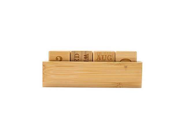 Вечный настольный календарь из бамбука, состоящий из одной подставки и четырех блоков с гравировкой.