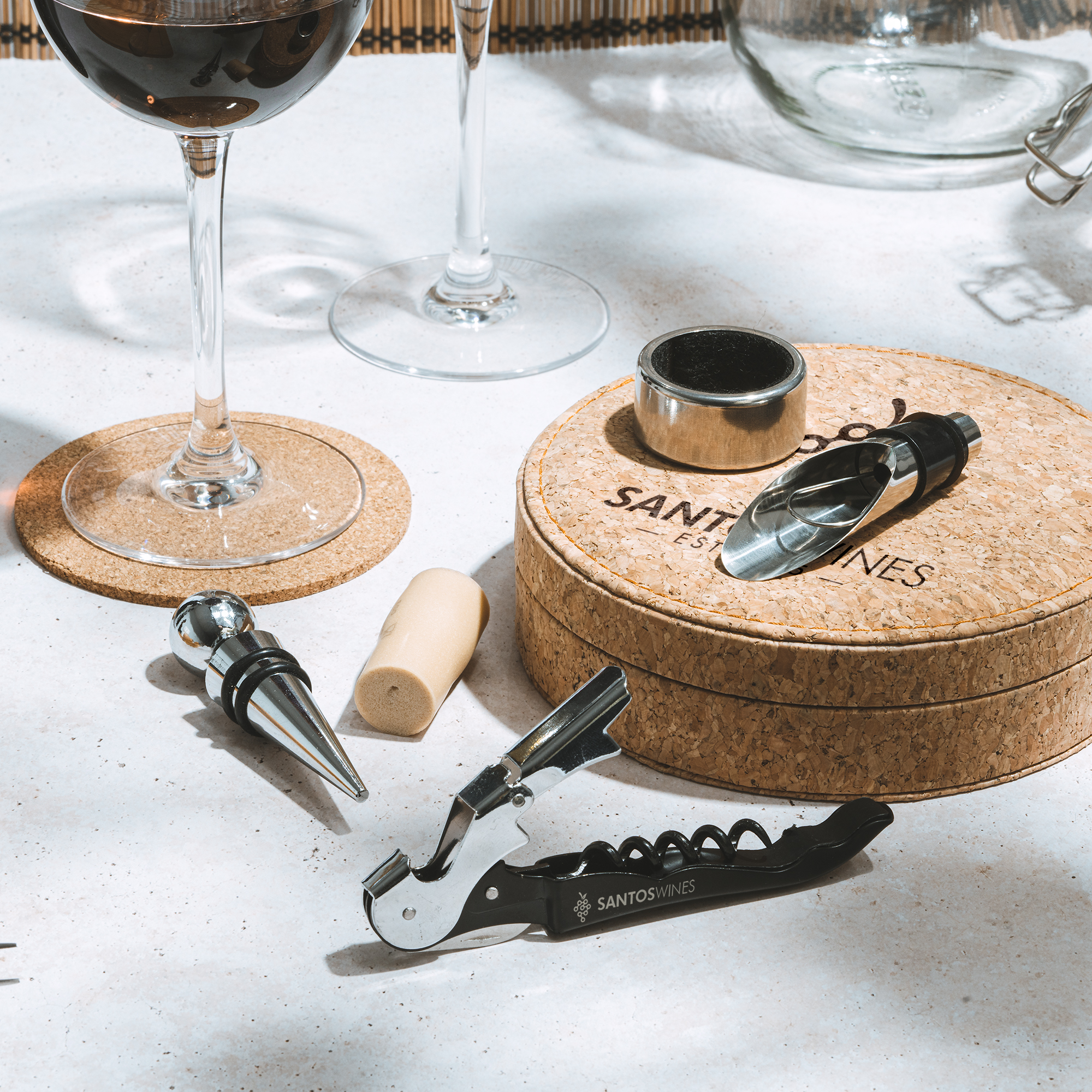 Набор для вина с аксессуарами из нержавеющей стали: штопор с двойным рычагом и складным лезвием, кольцо для капель, носик для наливания и пробка. Представлен в футляре из натуральной пробки с внутренней прокладкой и коробкой с эко-дизайном.