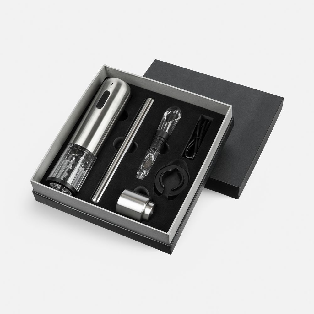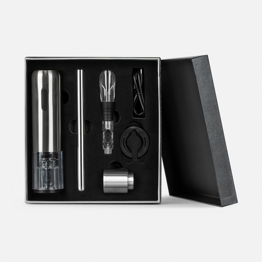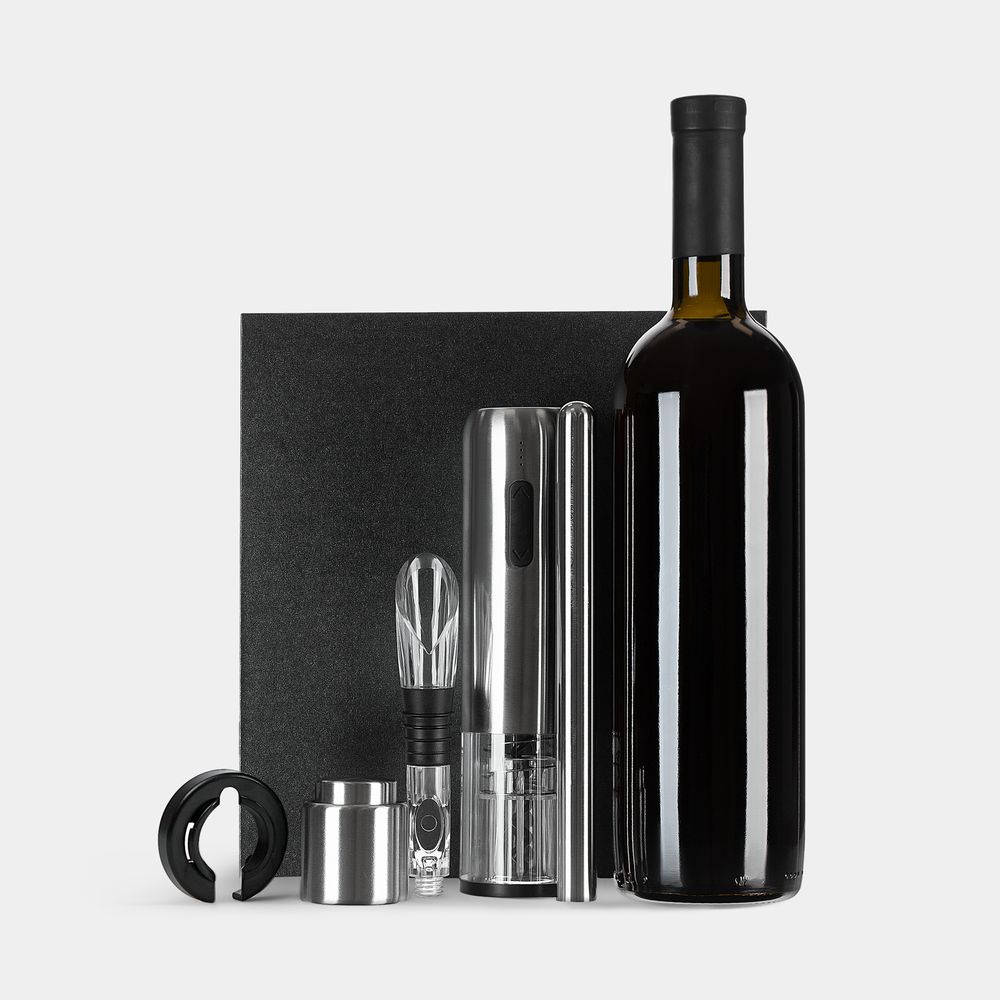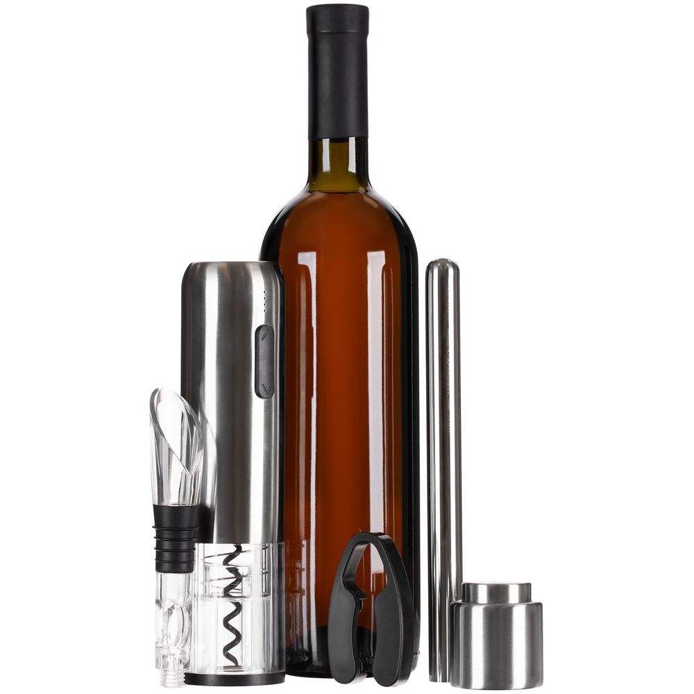 Набор Veritas — настоящая находка для ценителей вина. Благодаря продуманному дизайну автоматический штопор работает практически без участия человека. Изящный чиллер поддержит температуру напитка до часа, удобная разливочная воронка дополнительно аэрирует вино и не позволяет пролить его мимо бокала, а небольшая вакуумная пробка позволит сохранить вкусовые свойства напитка в течение нескольких дней.