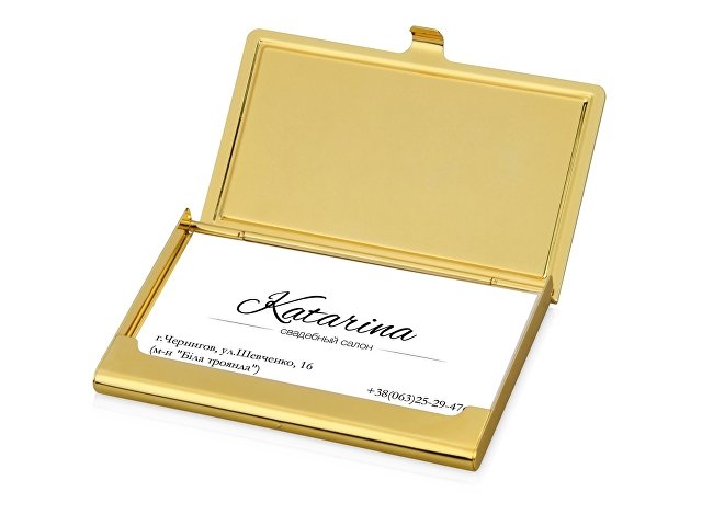 Стильная и элегантная металлическая визитница золотистого цвета подойдет в качестве презента как для мужчин, так и для женщин. На поверхности визитницы можно выгравировать поздравительную надпись или логотип организации.