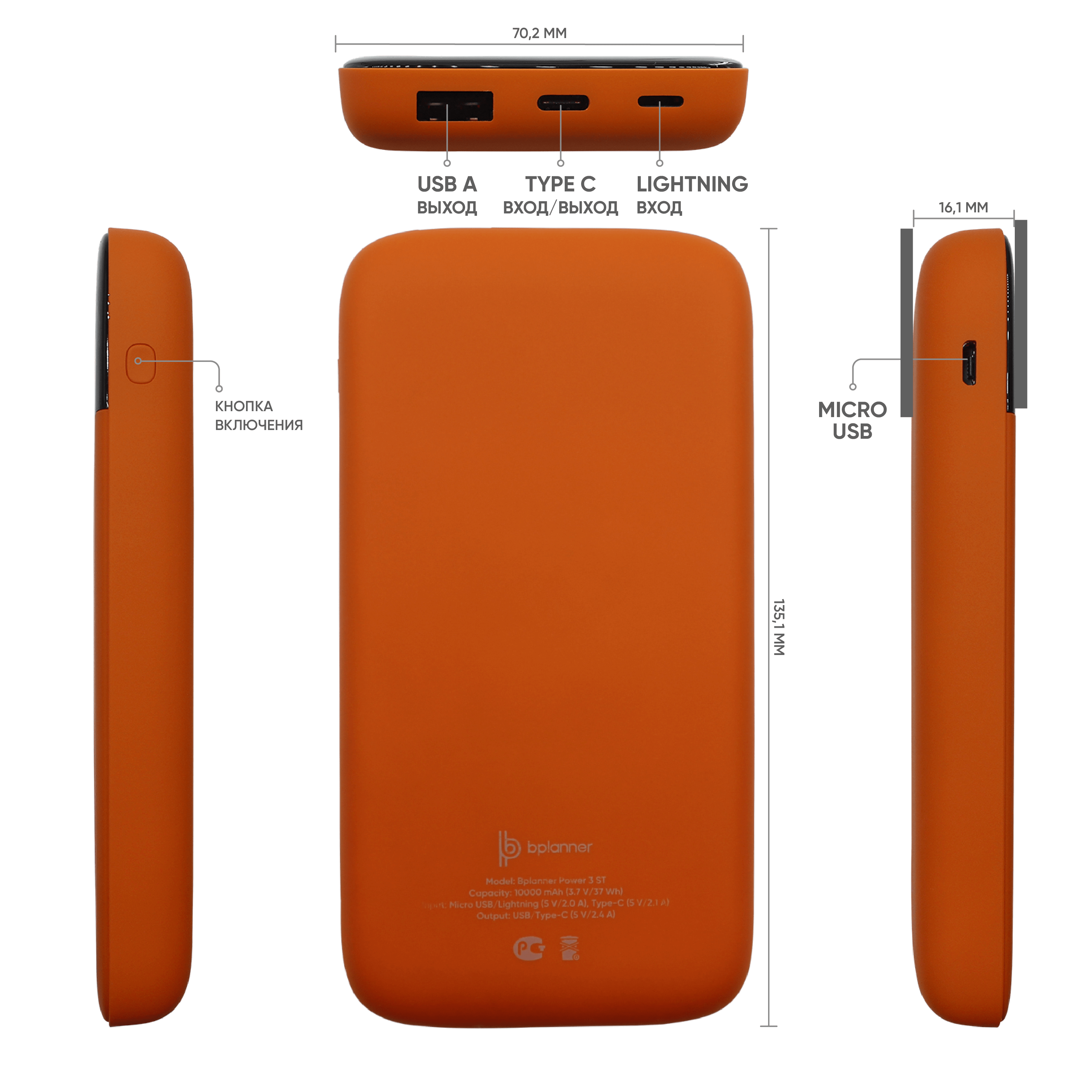 Внешний софт-тач аккумулятор Bplanner Power 3ST емкостью 10000 mAh оснащен цифровым индикатором заряда. Дизайн аккумулятора дополняет черный дисплей заряда на передней панели устройства. Внешний аккумулятор оснащен входом Type С, Micro-USB и Lightning, что упрощает процесс его зарядки. В комплекте идет кабель 3 в 1 и инструкция. Комбинируется с ежедневниками Bplanner 1, Bplanner 2, Bplanner 4 ,а также ручками с софт-тач покрытием.
