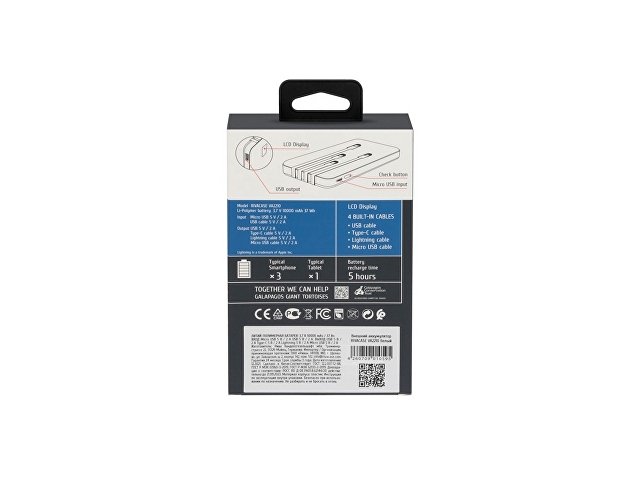 Литий-полимерный внешний аккумулятор емкостью 10000 мАч. Цифровой дисплей показывает уровень заряда. Защита от перегрузок, короткого замыкания, чрезмерного заряда и разряда. Автоматическое включение/выключение. Достаточно подключить кабель к разъему мобильного устройства и начнется заряд. Сквозной заряд - можно одновременно заряжать телефон и сам аккумулятор. Количество зарядов смартфона до 3 раз. (Зависит от емкости аккумулятора смартфона). ОСНОВНЫЕ ПРЕИМУЩЕСТВА: 4 встроенных кабеля - не надо искать подходящий кабель для Вашего телефона! Цифровой дисплей. Сквозной заряд. Тампопечать (1 цвет (белые изделия)) на данный товар осуществляется бесплатно. Оплачивается только настройка оборудования в размере 4500 рублей на весь тираж.