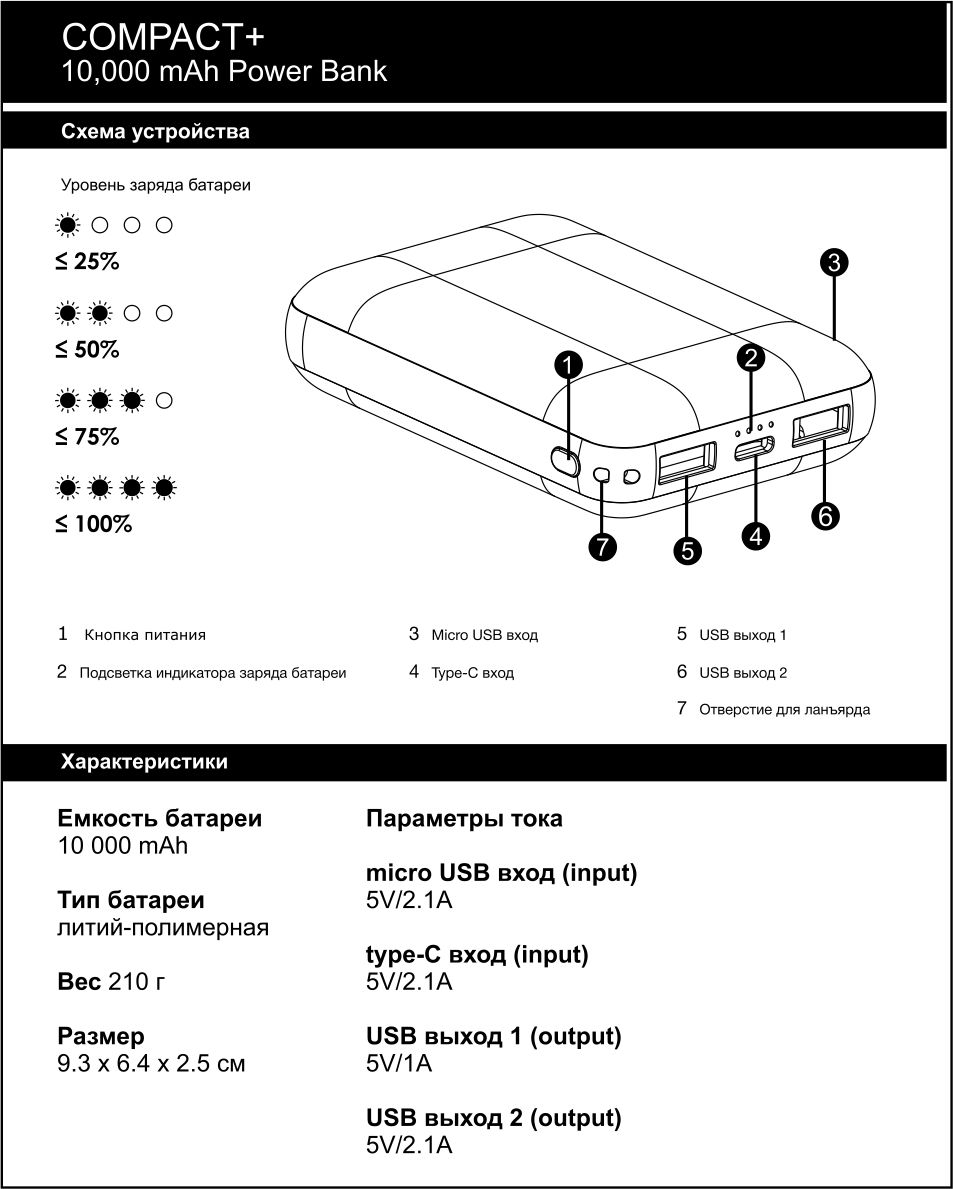 "Compact+" - зарядное устройство с оптимально подобранными характеристиками, отлично подойдет для повседневного использования как со смартфонами, так и с планшетами. Емкости в 10 000 mAh хватит даже активным пользователям гаджетов. Перед началом эксплуатации рекомендуется ознакомиться с инструкцией и полностью зарядить аккумулятор.