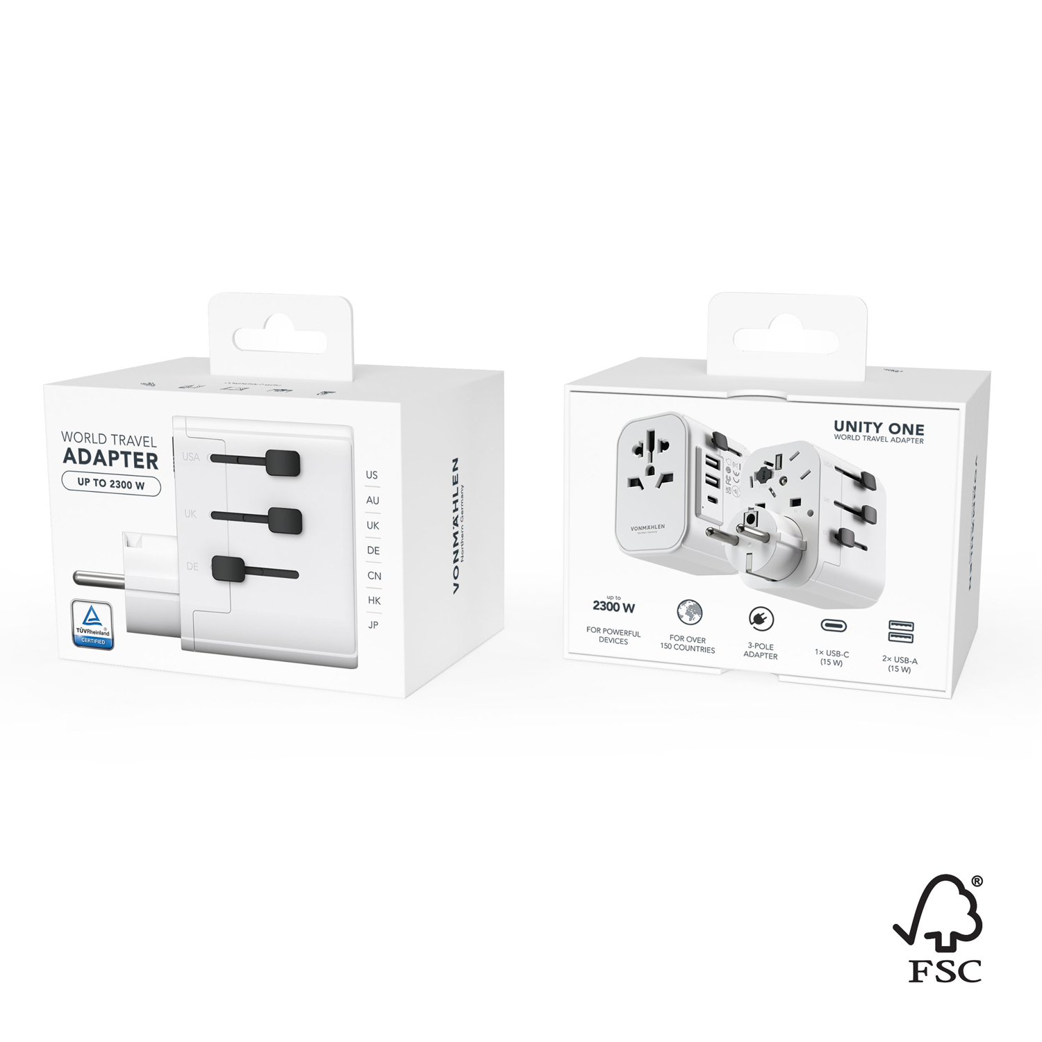 Unity One — это компактное дорожное зарядное устройство и идеальный спутник, куда бы вы ни отправились. Адаптер совместим с розетками более чем в 150 странах. Мощность до 2300 Вт, два порта USB-A и один порт USB-C (15 Вт). В Unity One встроена защита от перенапряжения и короткого замыкания. К нему возможно одновременно подключить такие мощные устройства, как фены или ноутбуки, а также удобно заряжать камеру, смартфон, планшет, фотоаппарат, бритву и другие устройства через дополнительные USB-порты. Продуманный дизайн выдвижных частей адаптера делает Unity One простым и удобным в транспортировке.