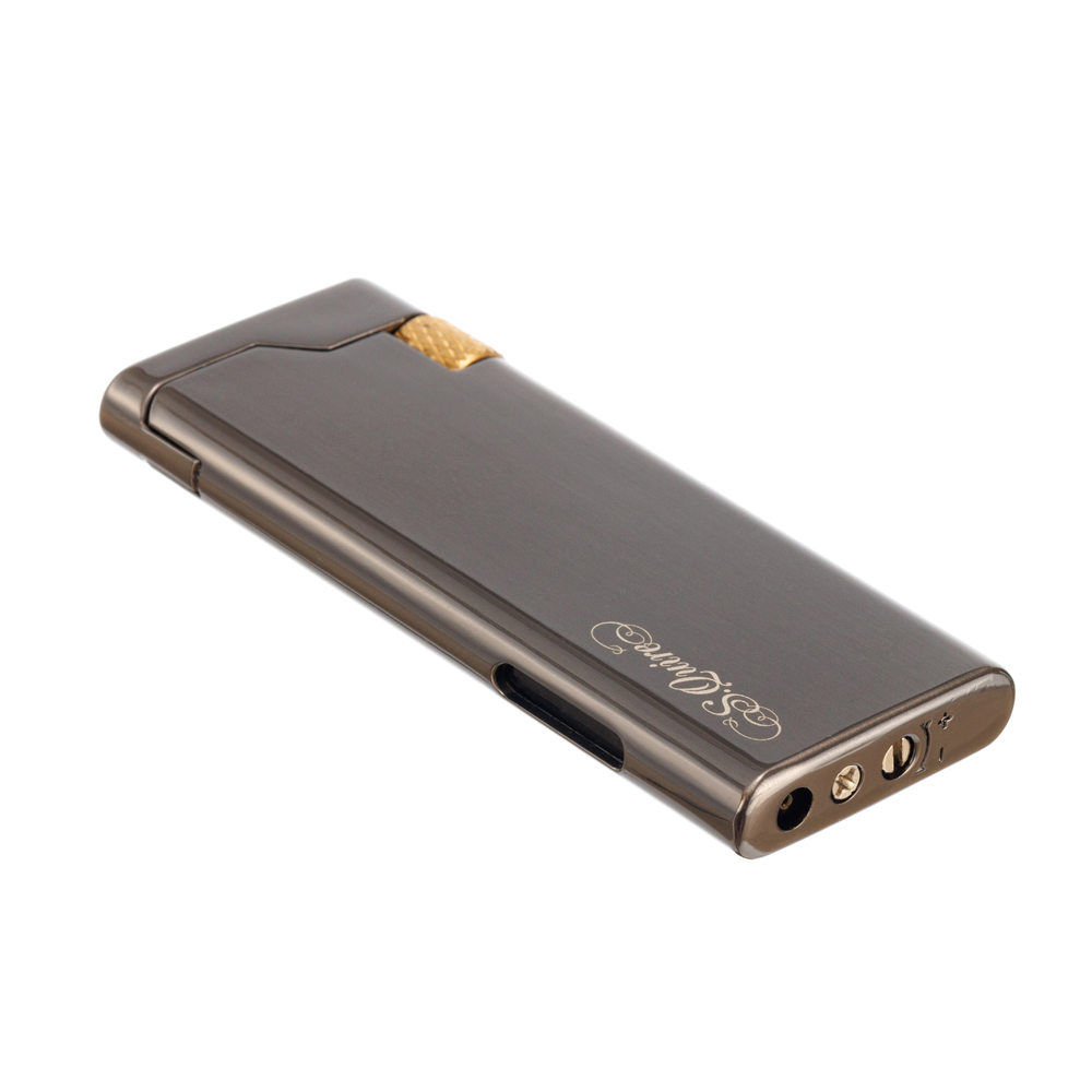 Стильная кремниевая зажигалка S.Quire с тонким корпусом цвета оружейная сталь с золотой каймой. Предусмотрена возможность дозаправки и регулировки пламени, также на корпусе есть удобное окошко для просмотра уровня газа.