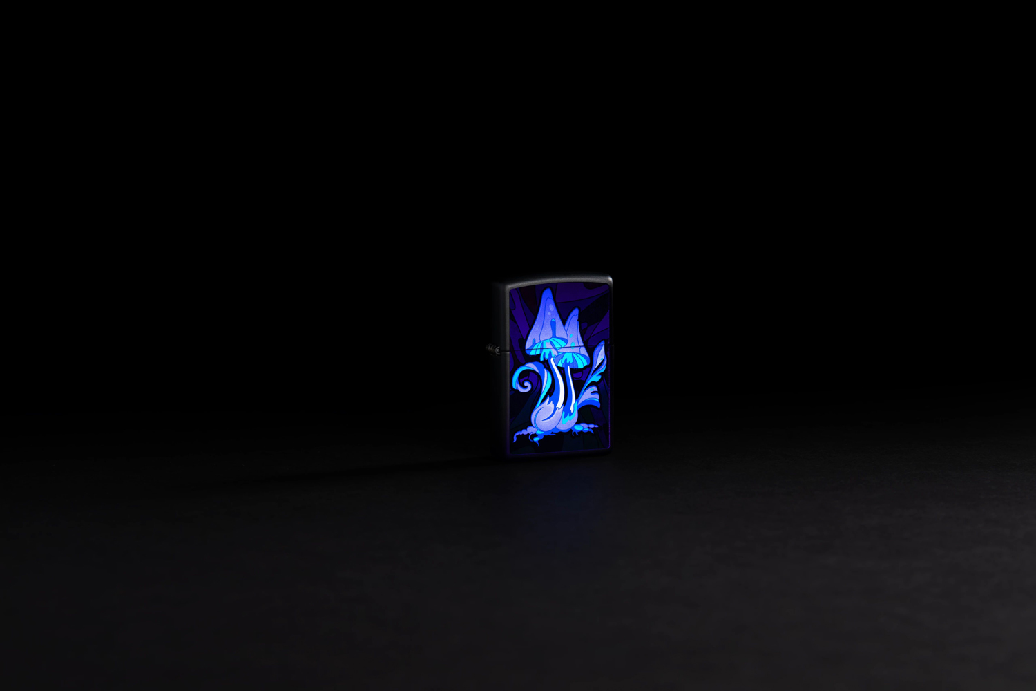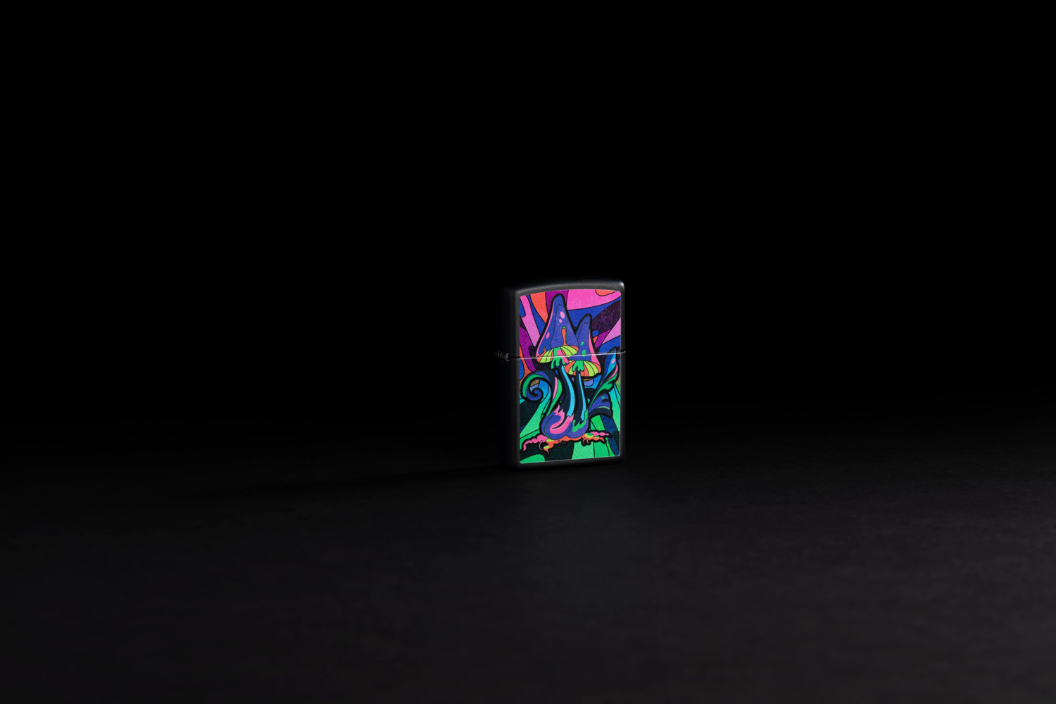 Яркие грибы раскачиваются по поверхности этой зажигалки Black Matte. Гипнотический дизайн оживает в ультрафиолетовом свете благодаря нашему специальному процессу Black Light, добавляя зажигалке загадочности и интриги.