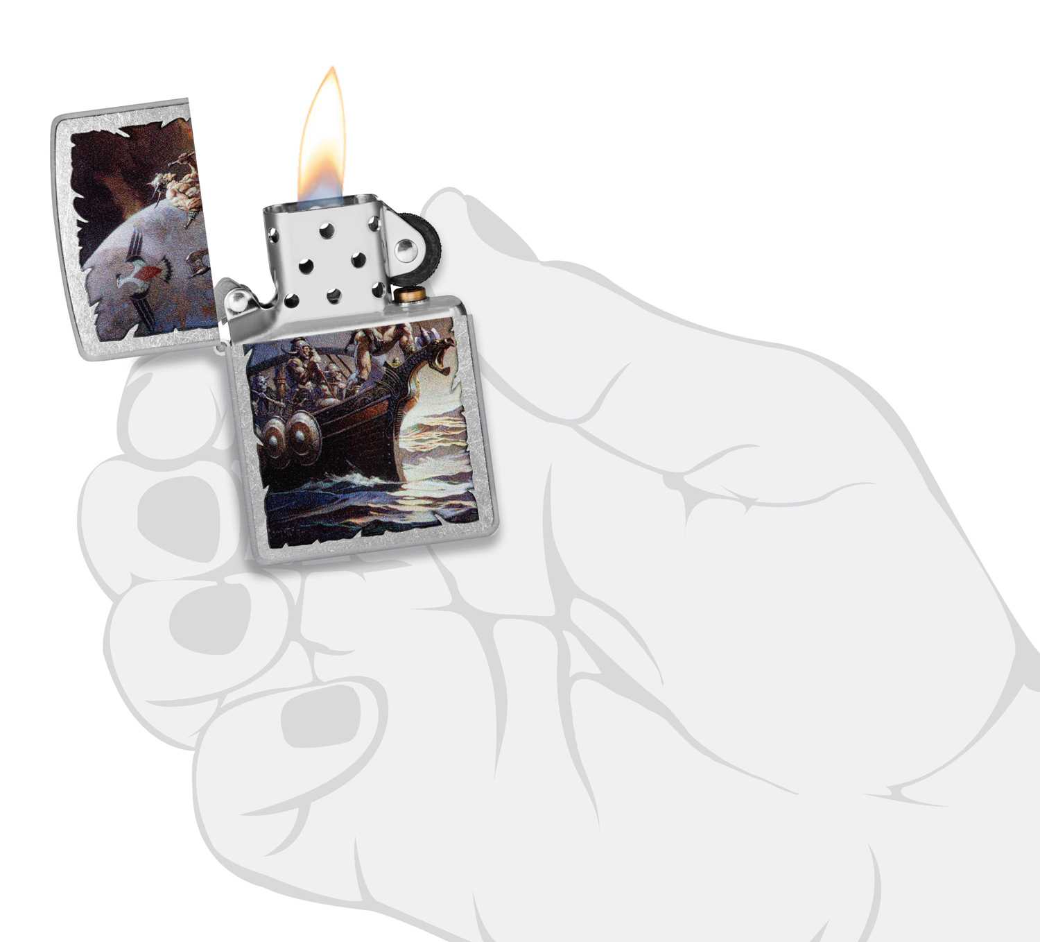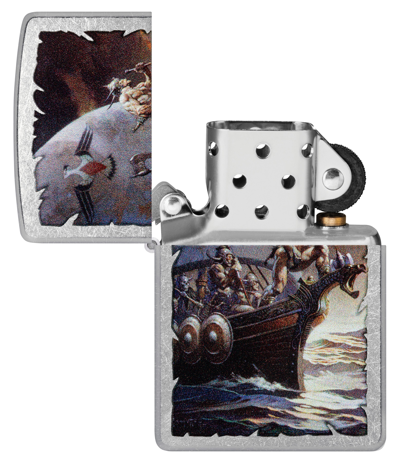 Известный как «Крестный отец фэнтези-арта», художник Фрэнк Фразетта был пионером этого жанра и широко известен за свои сказочные комиксы, картины, плакаты и обложки альбомов. Его яркая работа «Кейн на Золотом море», изображающая мужественных и закаленных викингов в бурном море, перенесена на классическую зажигалку с покрытием Street Chrome методом цветного изображения.
