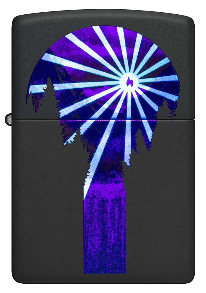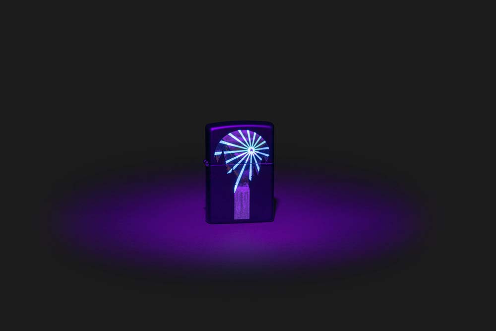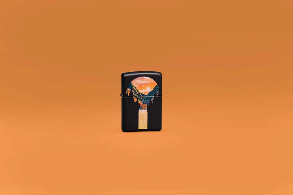 Мощный водопад бурлит под лучами заходящего солнца на этой потрясающей черной матовой зажигалке. Но стоит включить ультрафиолетовый свет – и великолепный пейзаж осветит классический значок пламени Zippo благодаря запатентованной технологии Black Light.