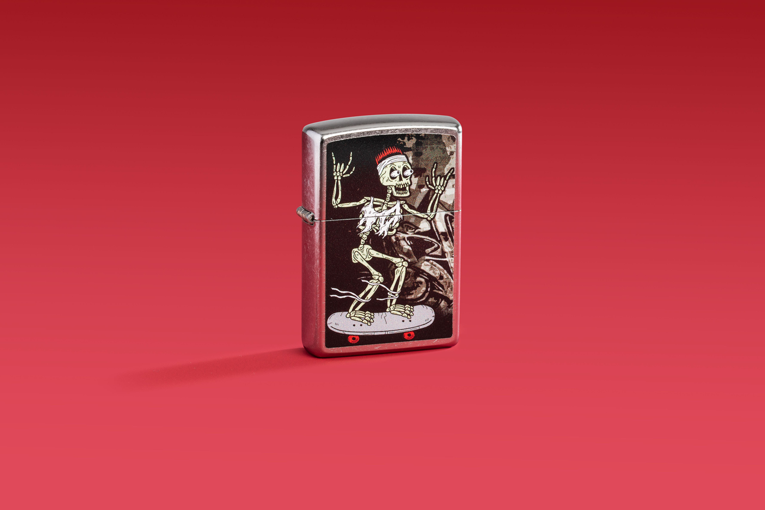Скейтборд – это жизнь… и не только. Корявый игривый скелет скользит по поверхности классической зажигалки Street Chrome.