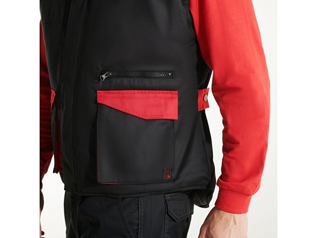 Рабочий жилет в двухцветной комбинации с несколькими карманами и высоким воротником.