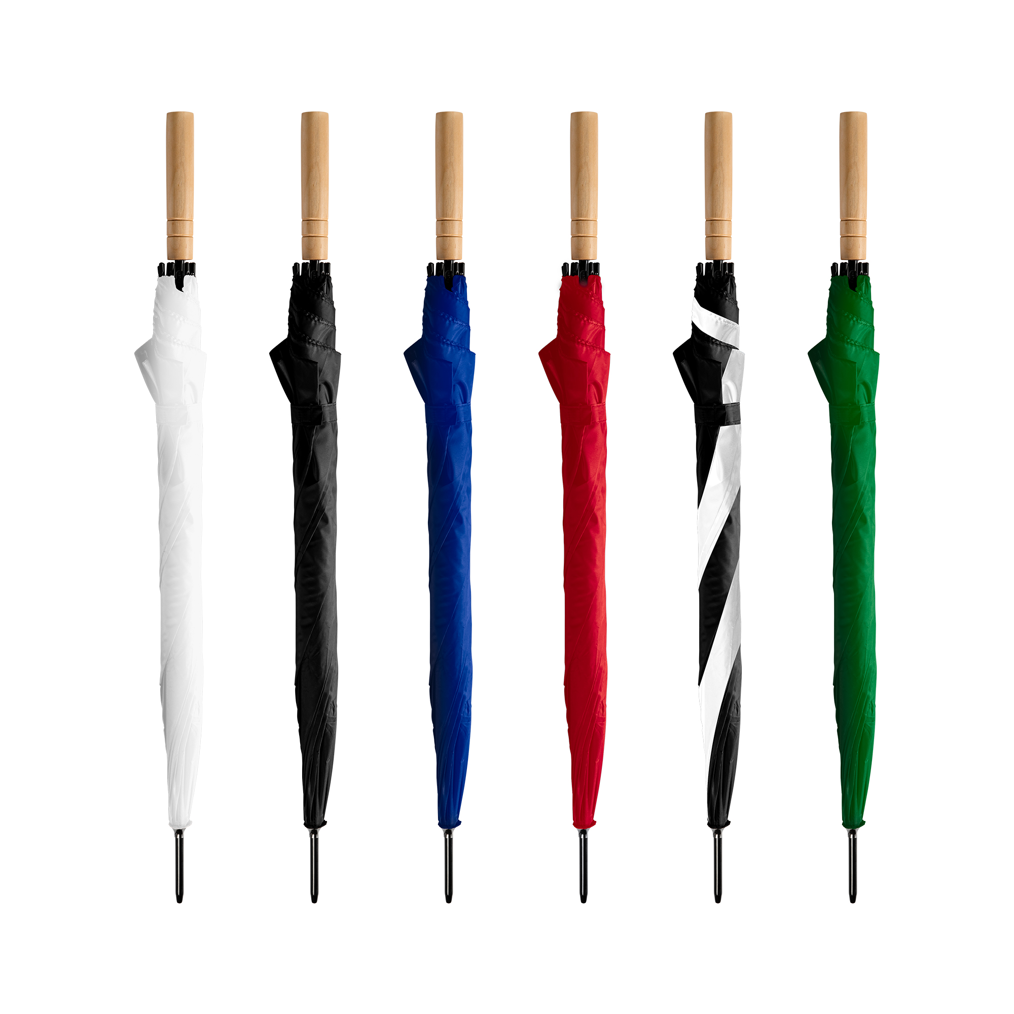 Зонт с деревянной ручкой и автоматическим открыванием. Ребра и наконечники черного цвета. Застежка на липучке.