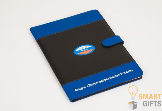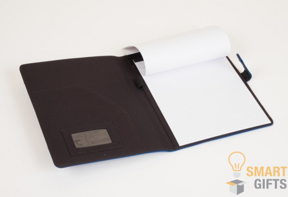 Папка, выполнена искусственной кожи в черно-синей цветовой гамме. Внутри имеется дополнительный карман для бумаг, прозрачный кармашек для визиток и крепление для ручки. В комплекте съемный блокнот из 20 листов в линейку формата А4.